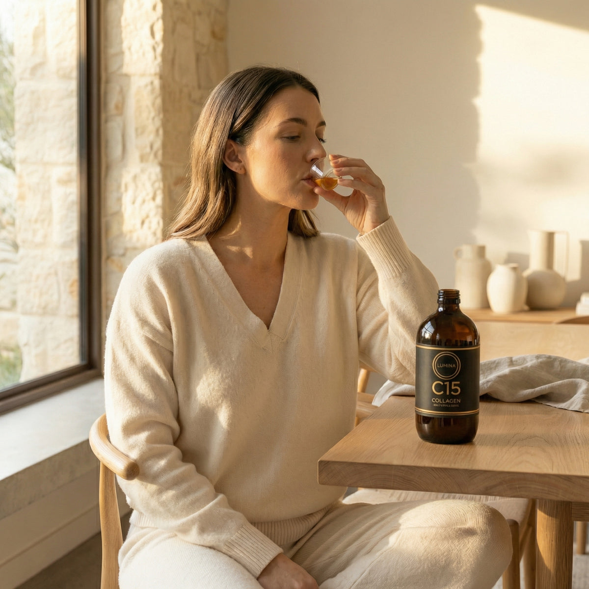 Collagen production declines naturally with age. Lumina C15 is formulated to support skin quality, connective tissue, and healthy ageing through consistent daily intake, using a dose aligned with human clinical research rather than cosmetic or low-dose formulations.