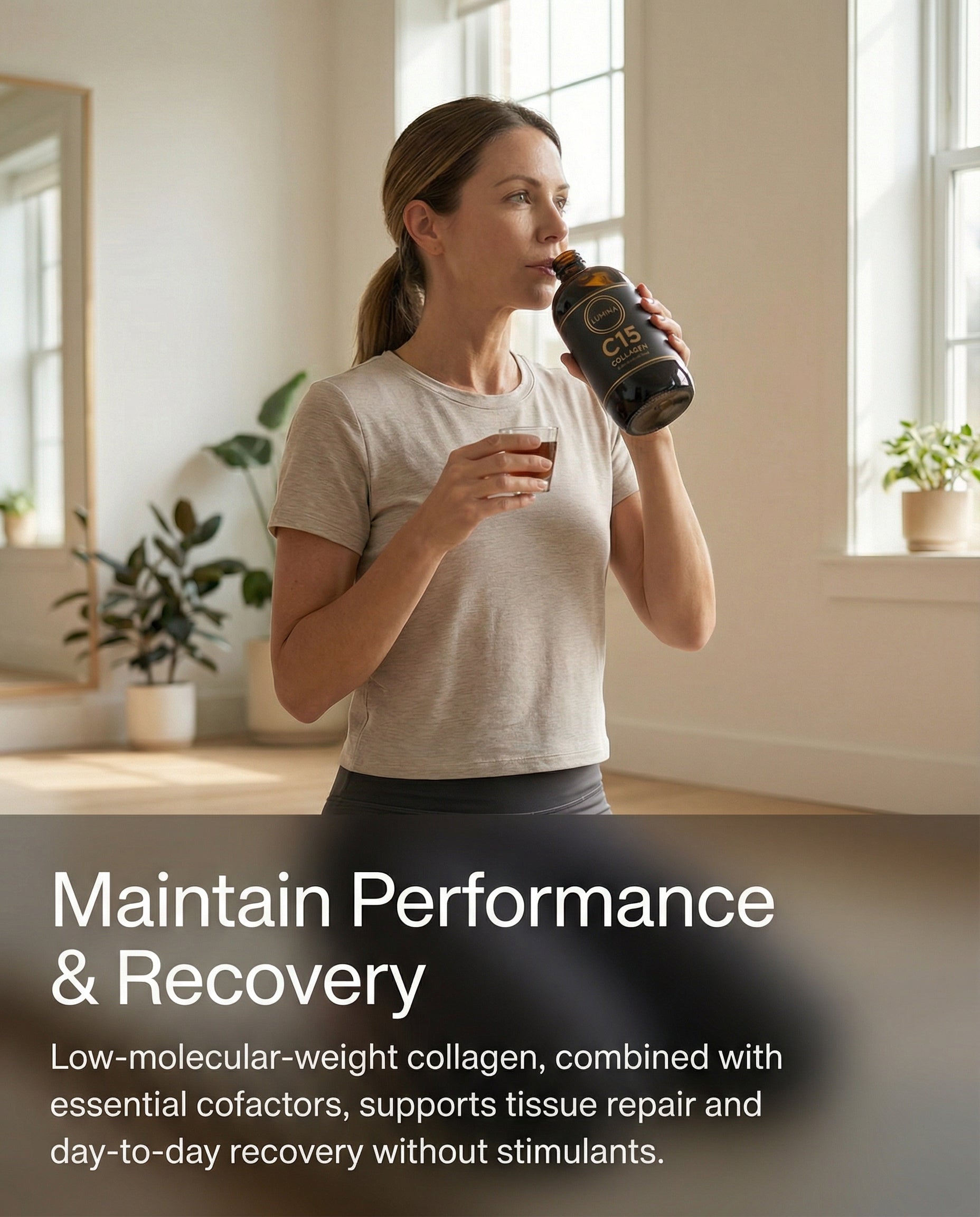 Delivered as a liquid shot, Lumina C15 removes the dissolution step, making collagen peptides and cofactors available immediately.