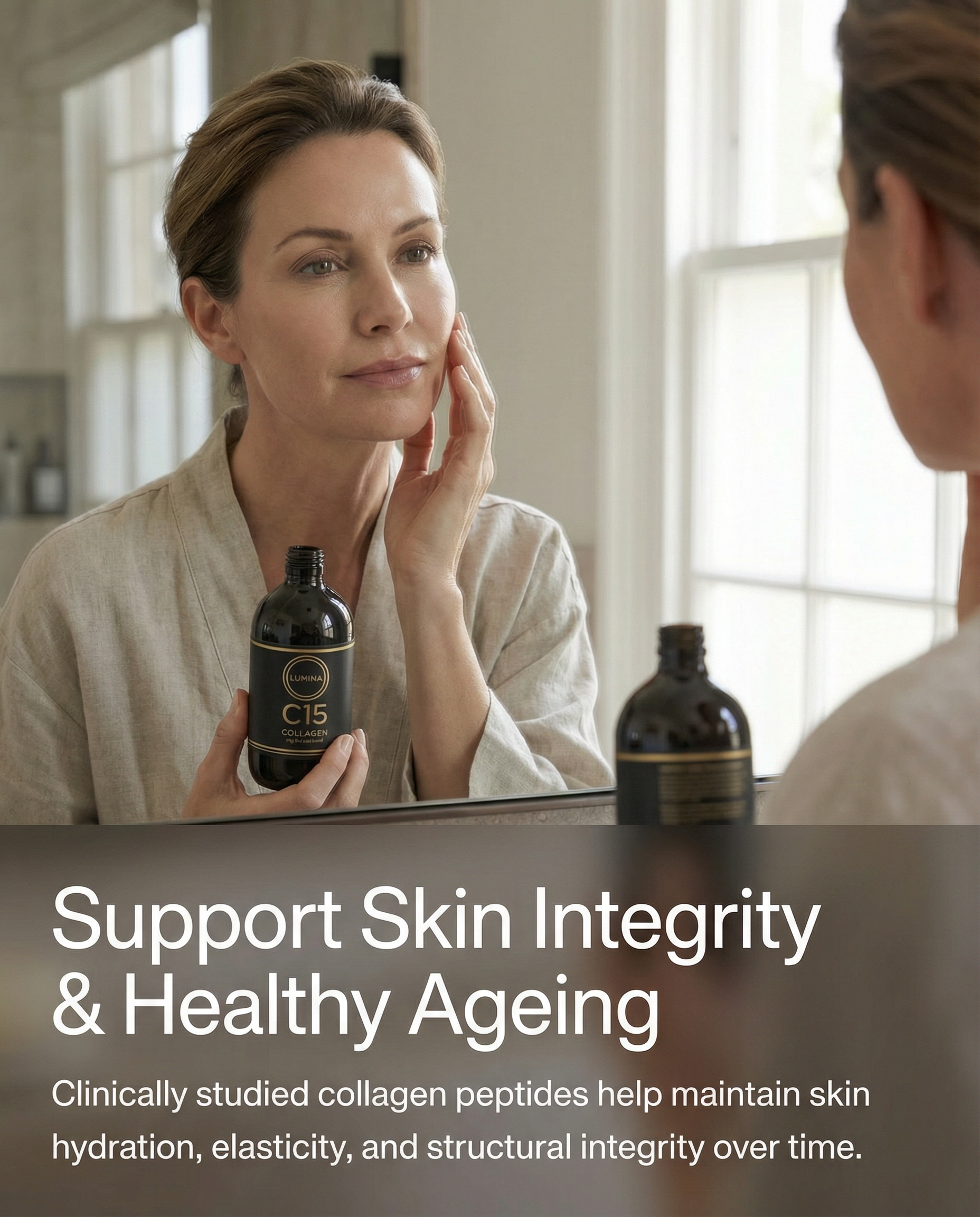 Lumina C15 is a high-dose, low-molecular-weight liquid collagen supported by targeted cofactors to optimise uptake, utilisation, and visible results.