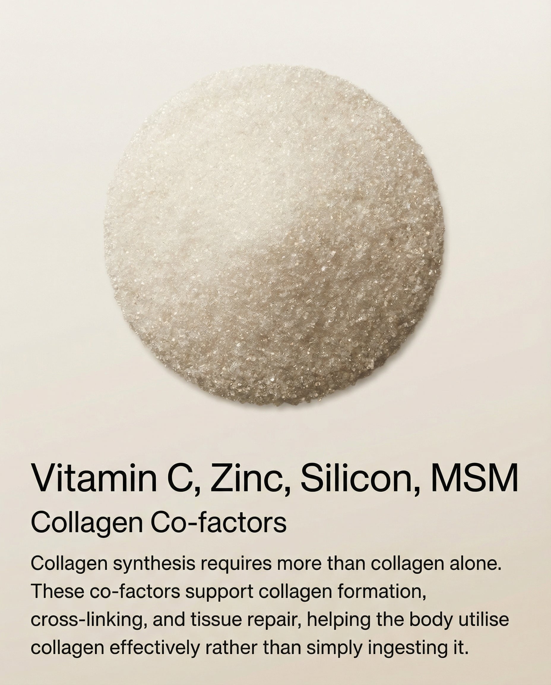 Vitamin C, zinc, and copper support collagen formation, helping convert peptides into functional skin, joint, and connective tissue support.