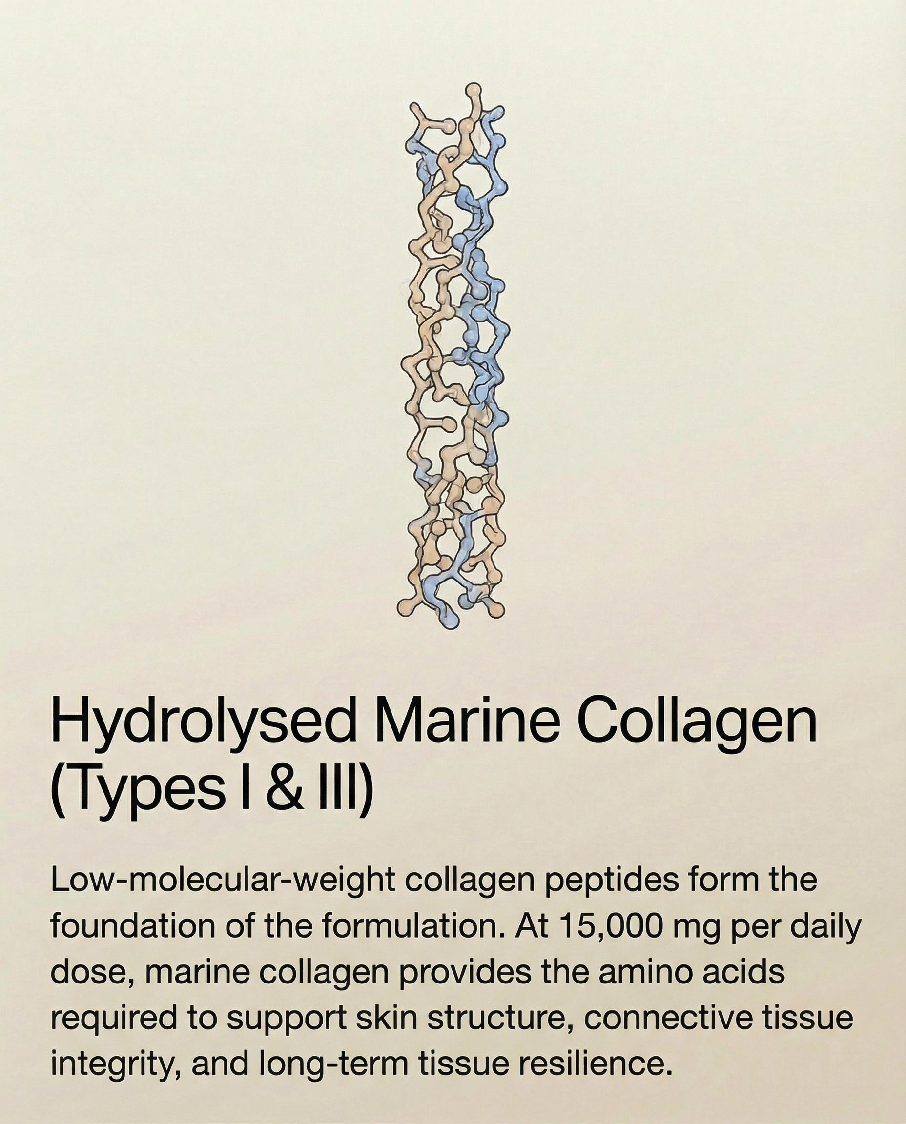 Lumina C15 uses hydrolysed marine collagen peptides averaging ~1,500 Daltons, a size suited for rapid absorption and transport.